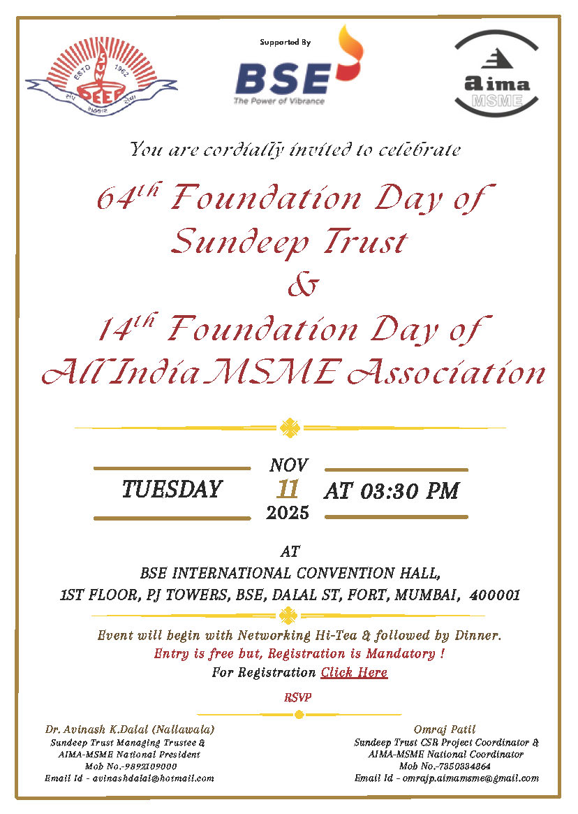 We cordially invite your goodself as one of our Special Guest to celebrate the 64th Foundation Day of Sundeep Trust & 14th Foundation Day of All India MSME Association (AIMA-MSME) on Tuesday, 11th November 2025, at 03:30 PM onwards at the BSE International Convention Hall, Fort, Mumbai.