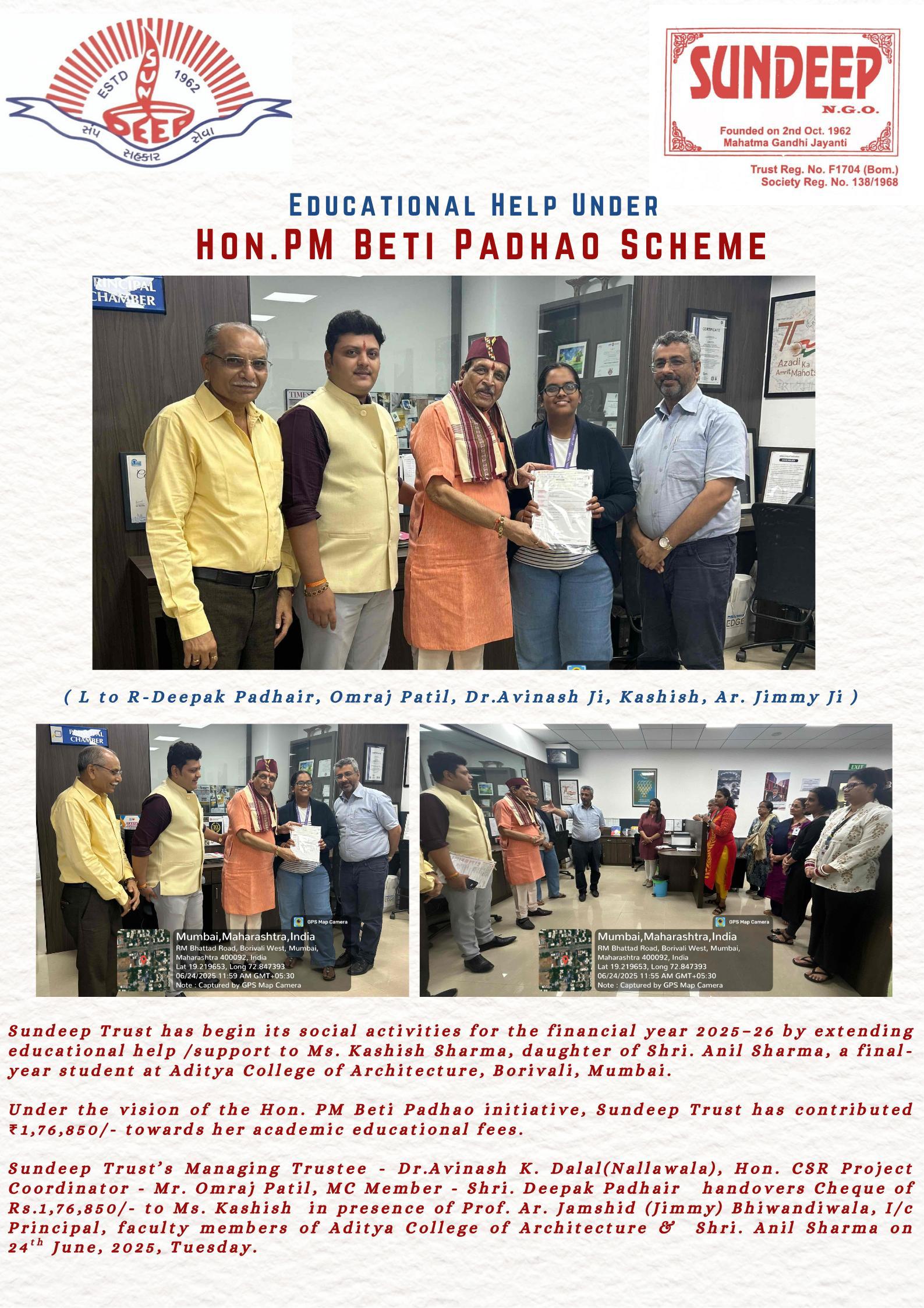 Under the PM beti padhao scheme Dr Avinash Nallawala of Sundeep Trust along with his committee members visited ACA to hand over scholarship fees of one of their final year students. The team was welcomed with felicitation and a vote of thanks for the great work the Trust has been conducting.